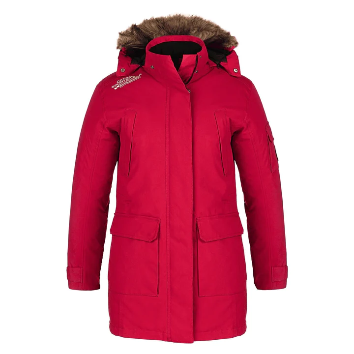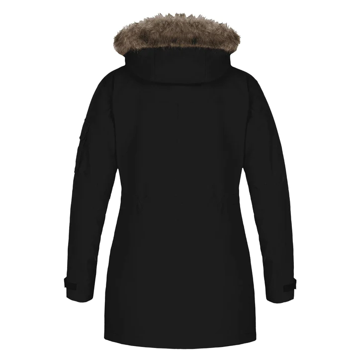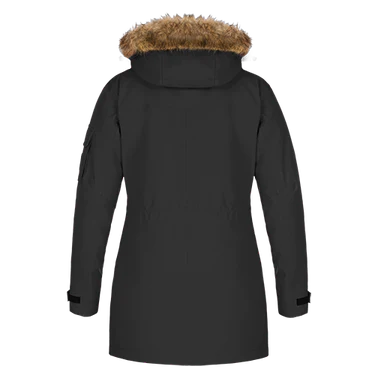 230 gsm – 6.8 oz./yd2 – 11.5 oz./lin. yd 100% nylon oxford 3000 mm waterproof rating, 3000 gsm breathability rating, wind resistant and water repellent finish. Insulation: 270 gsm body, 170 gsm sleeves Thermore insulation. The garment is fully seam sealed. Detachable hood with removable faux fur trim. Nine exterior and two interior pockets. Additional features include inner storm cuffs and waist drawstring. 2 way YKK center front zipper.